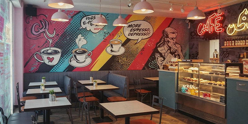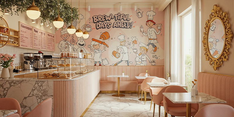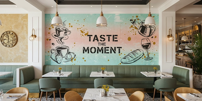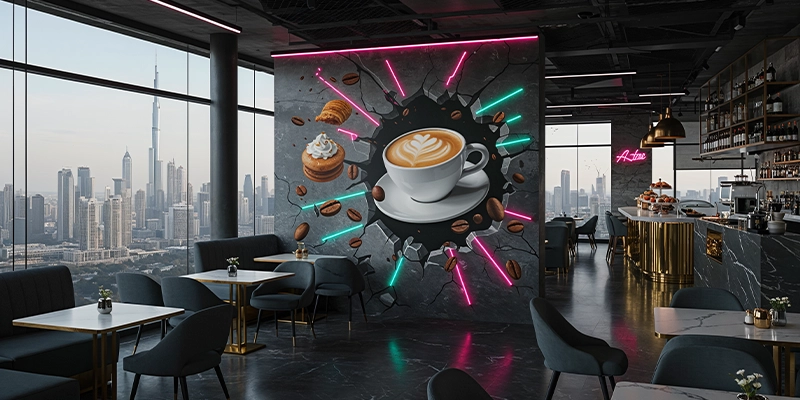 Stand out in Dubai’s competitive F&B scene with our custom mural solutions – whether you want a rustic pizza kitchen backdrop, a specialty coffee shop illustration, or a luxurious fine-dining feature wall, we deliver restaurant-grade artwork that’s both visually stunning and easy to maintain.